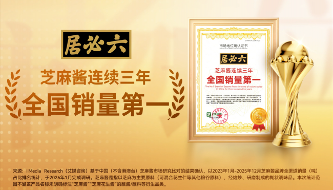 近期,六必居荣获全球领先的新经济产业第三方数据挖掘和分析机构iiMedia Research(艾媒咨询)授予的“芝麻酱连续三年全国销量第一”市场地位确认。