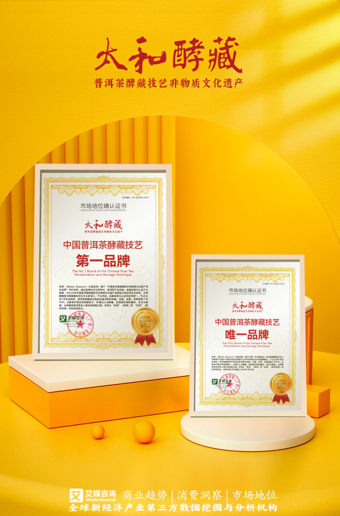 近期,太和酵藏获全球领先的新经济产业第三方数据挖掘和分析机构iiMedia Research(艾媒咨询)授予的“中国普洱茶酵藏技艺第一品牌”“中国普洱茶酵藏技艺唯一品牌”市场地位确认。