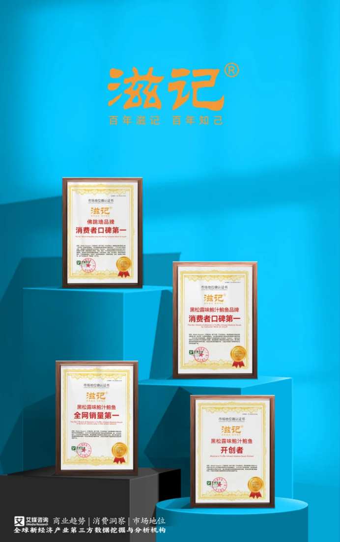 近期,滋记获全球领先的新经济产业第三方数据挖掘和分析机构iiMedia Research(艾媒咨询)授予的“黑松露味鲍汁鲍鱼开创者”“黑松露味鲍汁鲍鱼全网销量第一”“佛跳墙品牌消费者口碑第一”“黑松露味鲍汁鲍鱼品牌消费者口碑第一”四项市场地位确认。