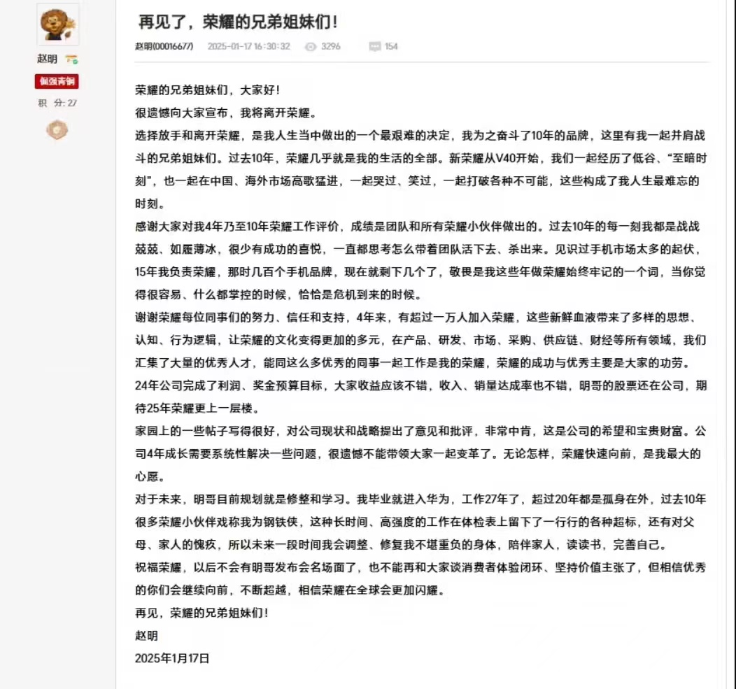- 荣耀确认赵明离职 李健接任CEO